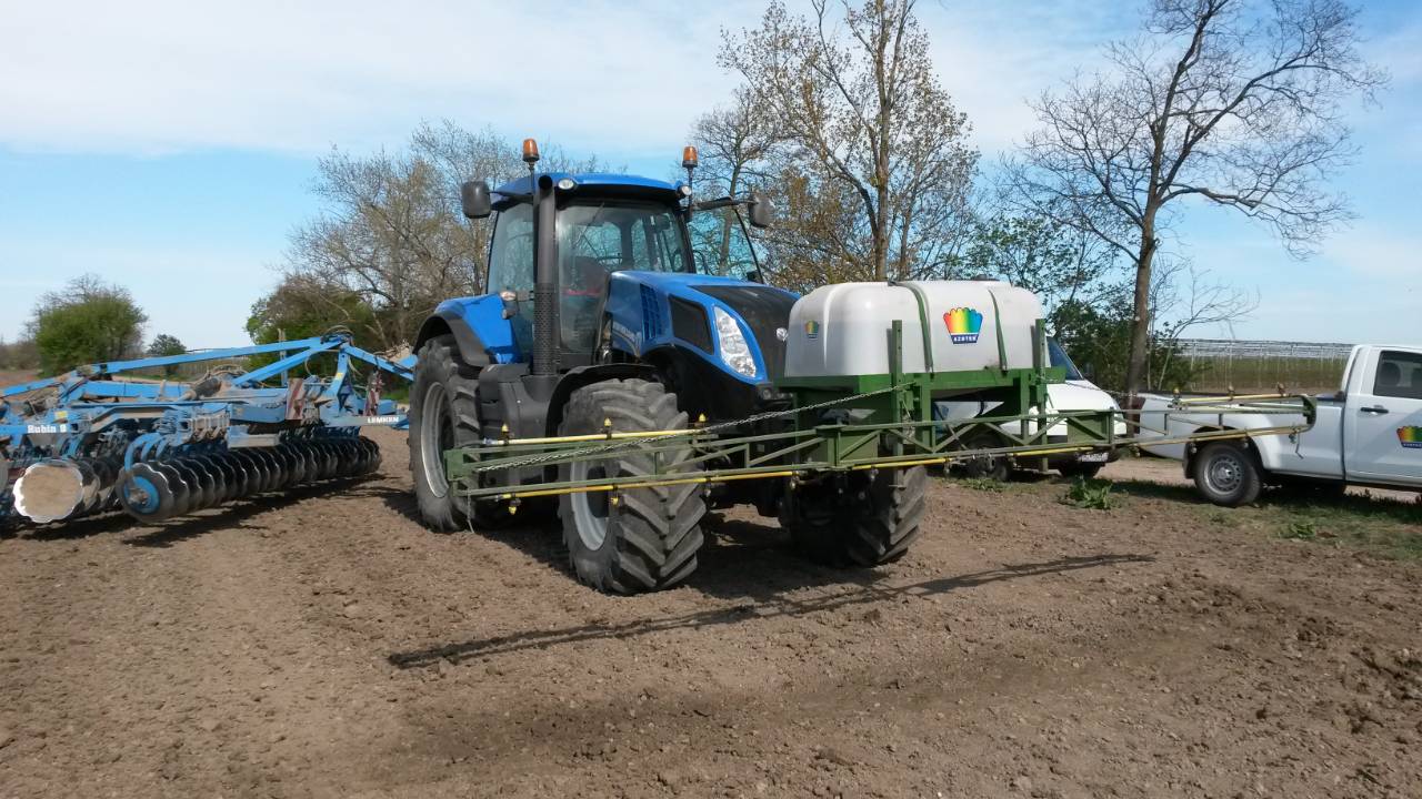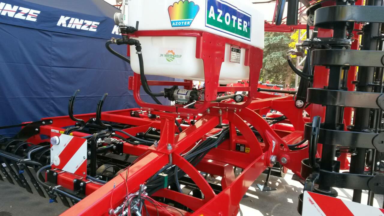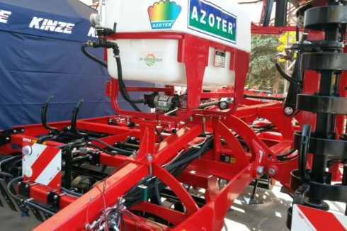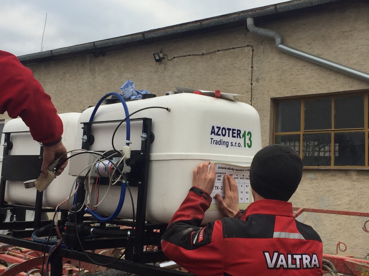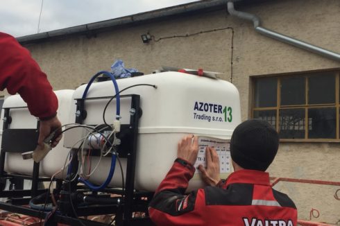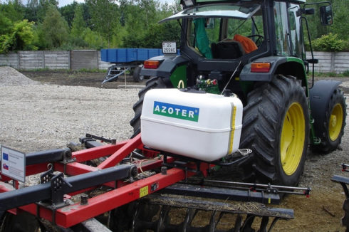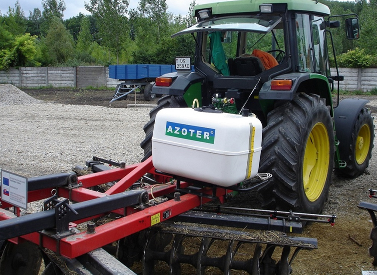 - Postoji i mogućnost primene pomoću aplikatora industrijskih đubriva sa zapreminom reze rvoa ra od 400 i 600 litara sa podesivim radnim zahvatom do 10 m, smeštenim na trotačkastom prednjem produžetku za traktore (nije potreban prednji kardanski izvod budući da je aplikator opremljen sopstvenom jedinicom upravljanja i elektromotorom, koji je priključen na bateriju traktora) U rezervoar aplikatora će se staviti koncentrat AZOTER- a ili isti može da seredi sa vodom u odnosu 1:1.